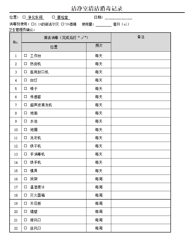 把一些位置寫出來,比如在哪個車間、哪個菌檢室;然后就是日期;再就是消毒劑的使用,用了多少、用的哪種消毒劑;Zui后留出一個簽字的地方即可。